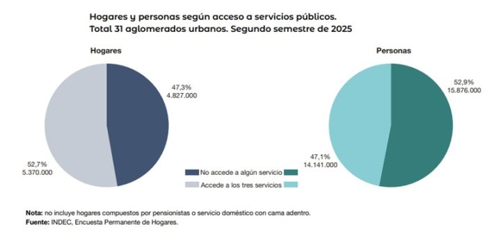 Este miércoles, el Indec publicó los “Indicadores de condiciones de vida de los hogares” correspondientes al segundo semestre de 2025. El relevamiento comprende 31 aglomerados urbanos donde viven 10,2 millones de hogares y 30,0 millones de personas.