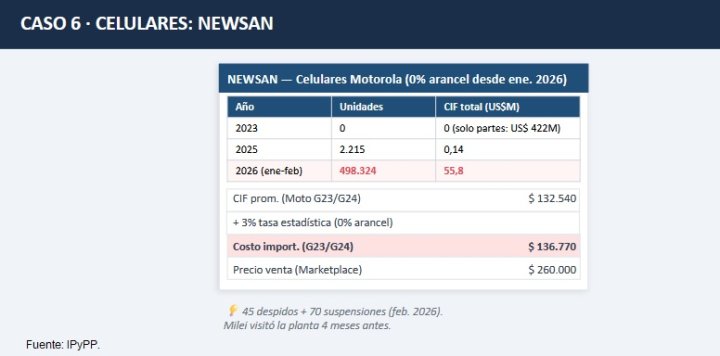 Newsan: el costo unitario de importar un celular Motorola G23/G24 es de $ 136.770 y lo venden en el mercado local a $260.000. El documento recuera que Milei visitó la planta y cuatro meses después hubo 45 despidos y 70 suspensiones.