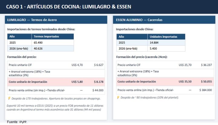 Essen: la empresa importa cacerolas de China con un costo unitario (incluyendo fletes e impuestos) de unos $50.000. Sin embargo, en sus canales de venta se ofrecen a $384.000 (sin contar impuestos nacionales). Despidió 30 trabajadores.