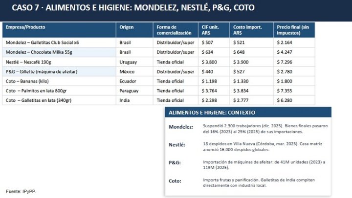 Mondelez: suspendió 2.300 trabajadores a fines de 2025 y los bienes finales pasaron del 16% (2023) al 25% (2025) de sus importaciones. El costo unitario de importar la galletita Club Social es de $521 y lo vende a $2.164.